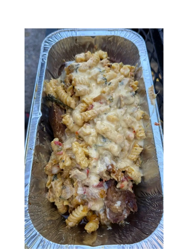 Our Turkey Leg Stuffed with Rotel Cajun Pasta is a flavor explosion you won’t forget. We start with a big, tender, fall-off-the-bone smoked turkey leg, seasoned to perfection. Then we pack it full with our creamy, spicy Rotel Cajun pasta loaded with cheese, zesty tomatoes, and bold Cajun seasoning. Every bite is the perfect mix of smoky turkey and rich, flavorful pasta, creating a soul-satisfying dish that’s hearty, indulgent, and guaranteed to make your taste buds dance. This is comfort food turned all the way up!